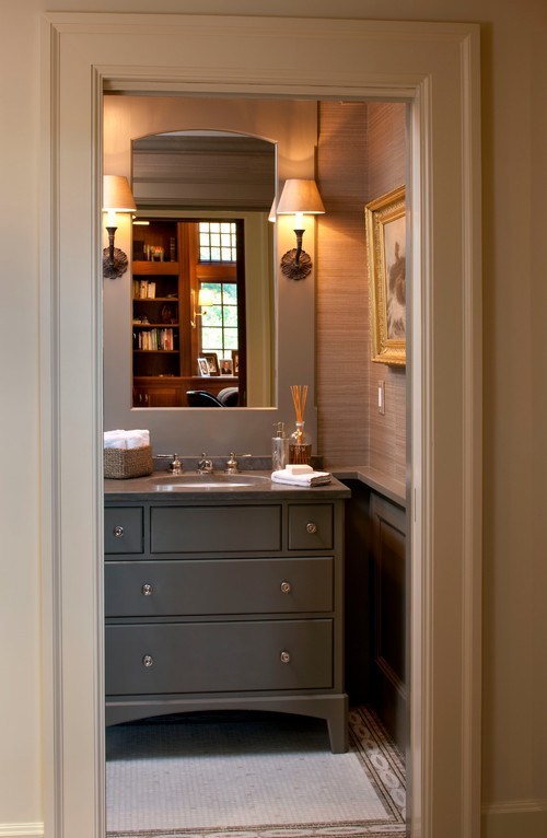 This is the smallest room in the house, so you certainly don’t want to overwhelm it with a large vanity. Remember, this is not a room you use for bathing, so you won’t have a lot of storage needs either. All you need here is a small vanity that holds one sink and a small countertop.